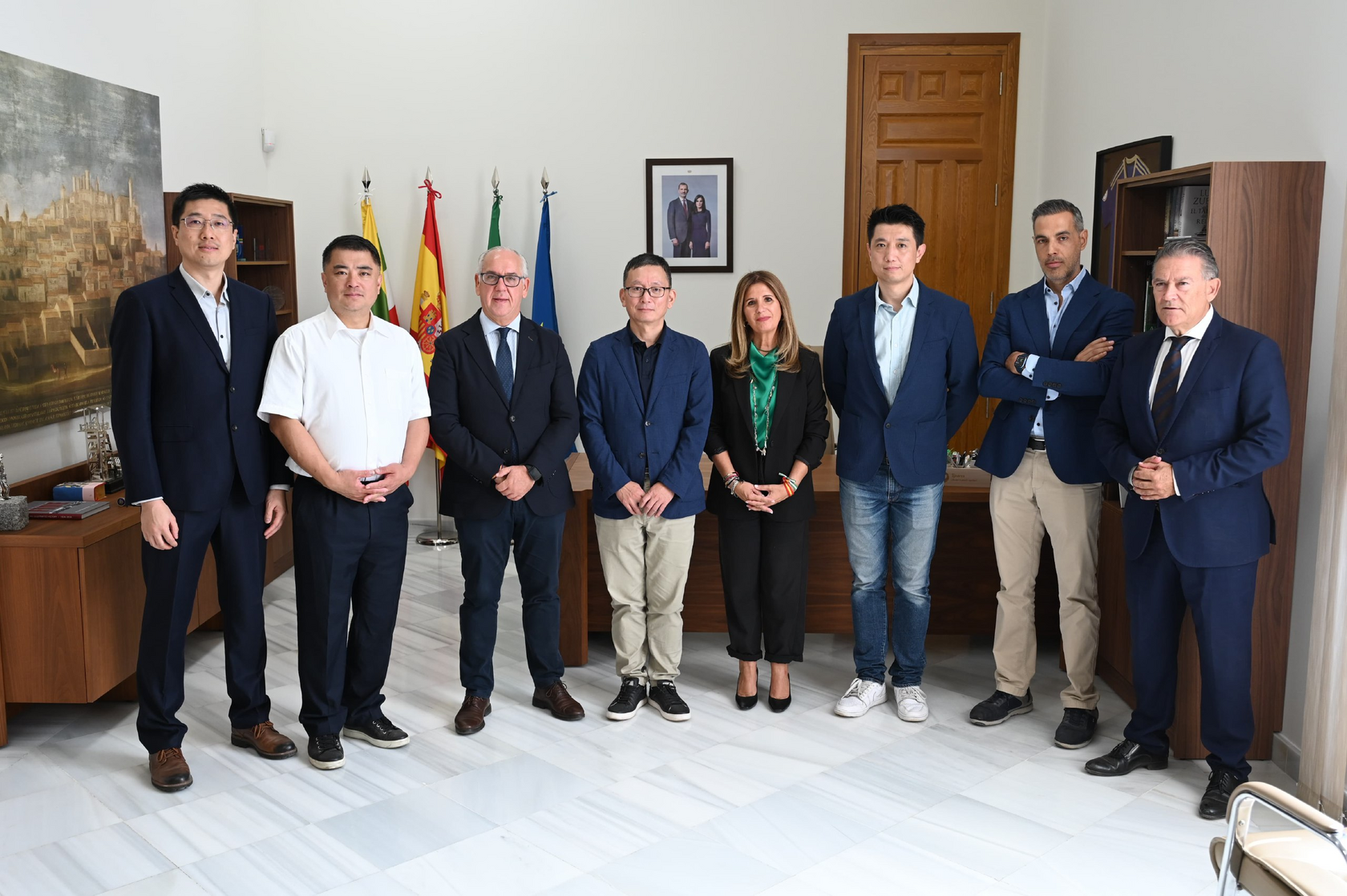 During a key institutional meeting, Linares mayor Auxi del Olmo welcomed representatives from Santana Motors and Coronet, including Zewen Liu, president of the partner company. The session also brought together important local stakeholders such as the Chamber of Commerce, Cetemet, and the Polytechnic School.